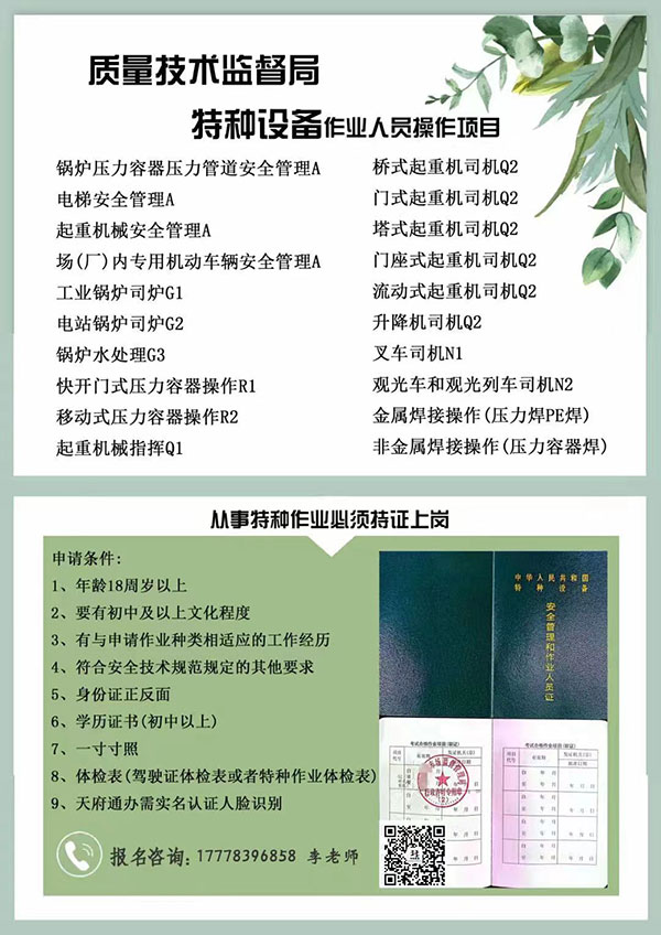四川省雅安市質量技術監督局《特種設備作業證》報名咨詢電話:李老師:177 7839 6858(微信同號)報名區域:雨城區、名山區、滎經縣、漢源縣、石棉縣、天全縣、蘆山縣、寶興縣、隨時報名,周周考試,國網查詢,全國通用,新訓,復審,同步進行(全川40家合作機構和考試機構,方便快捷)